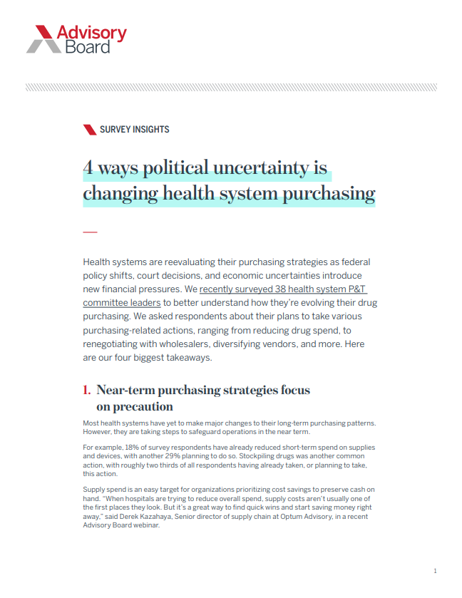 Advisory Board surveyed health system leaders on how they are reevaluating purchasing strategies as federal policy shifts, court decisions, and economic uncertainties introduce new financial pressures.