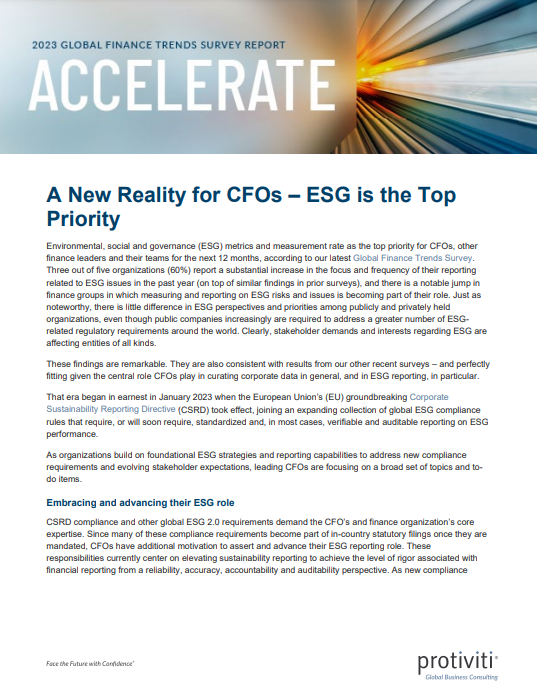 The 2023 Global Finance Trends survey results reveal that CFOs are embracing their ESG role. Read insights from our latest report to discover the multi-faceted challenges and opportunities CFOs face in navigating the evolving landscape of ESG reporting and compliance, including: