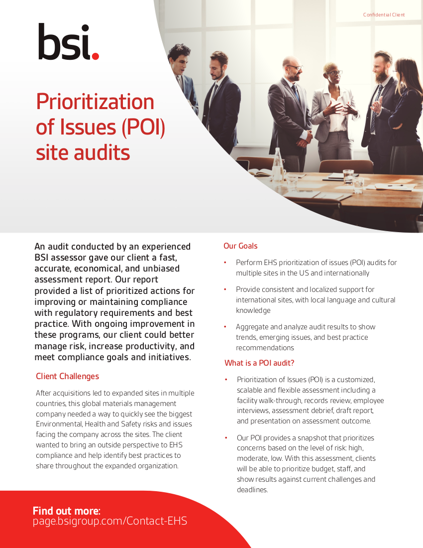 After acquisitions led to expanded sites in multiple countries, this global leader in materials management needed a way to quickly see the biggest environmental, health and safety risks and concerns facing their company overall and across all of their facility locations. The client turned to BSI to conduct Prioritization of Issues (POI) audits for nine facilities in the US and eight in Asia, and provide trends, highlight emerging issues, and recommend best practices.