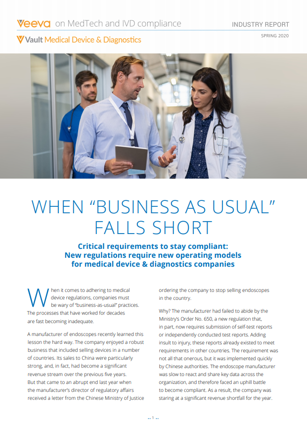 With regulations in the medical device & diagnostics industry ever evolving it’s critical that companies adopt an agile operation model in order to stay compliant. Take a deeper dive into the "business-as-usual" practices that medical device companies should be wary of when it comes to adhering to new regulations. While these processes have worked for decades, they're quickly becoming inadequate.