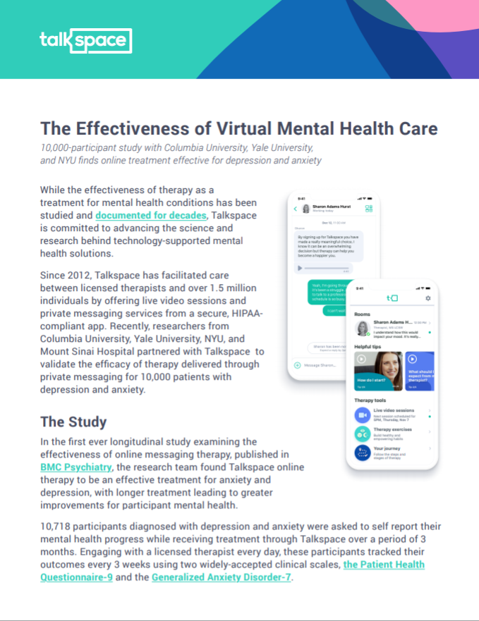 Since 2012, Talkspace has facilitated care between licensed therapists and over 1.5 million individuals by offering live video sessions and private messaging services from a secure, HIPAA-compliant app. Recently, researchers from Columbia University, Yale University, NYU, and Mount Sinai Hospital partnered with Talkspace to validate the efficacy of therapy delivered through private messaging for 10,000 patients with depression and anxiety.